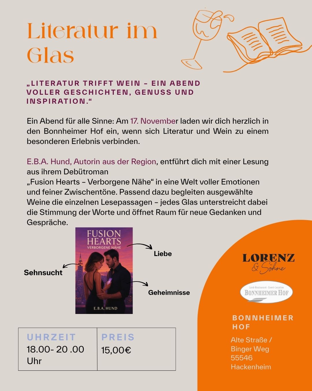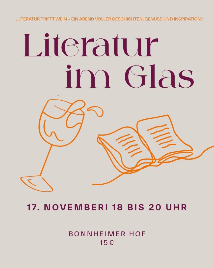 Ein Abend für alle Sinne: Am 17. November ab 18 Uhr laden wir dich herzlich in den Bonnheimer Hof ein, wenn sich Literatur und Wein zu einem besonderen Erlebnis verbinden.